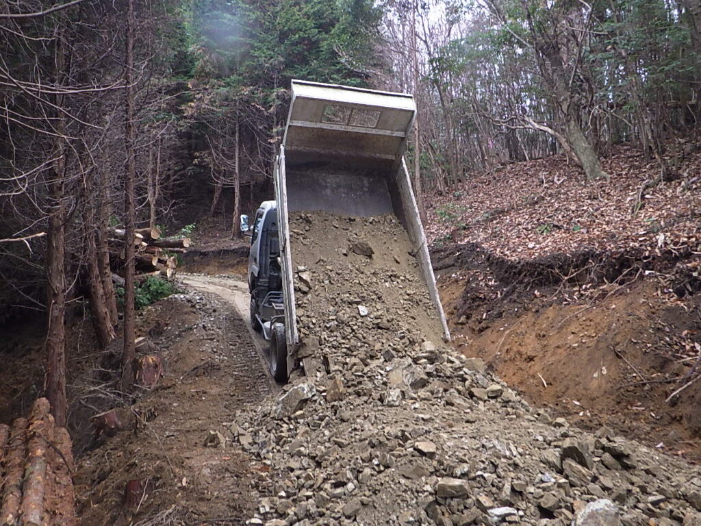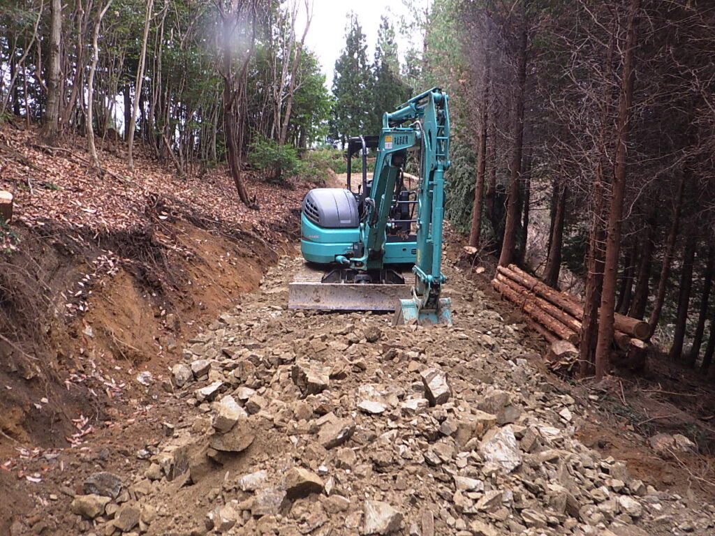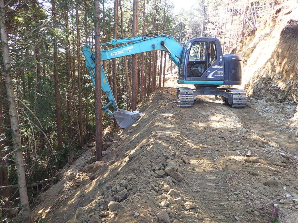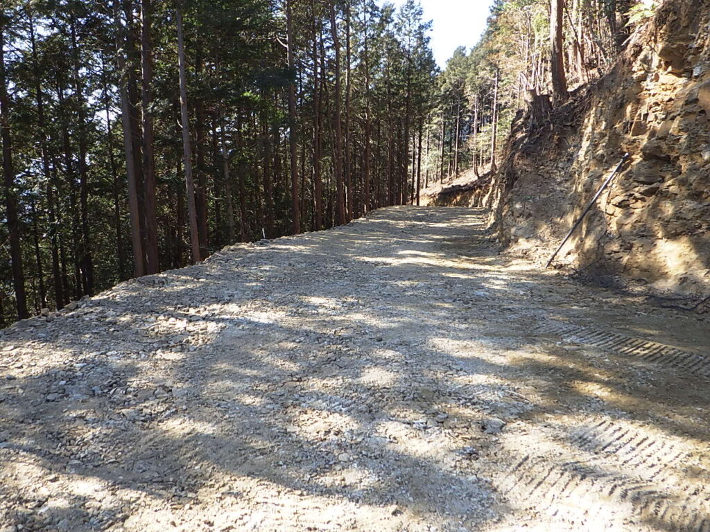工事概要:施工延長310.0m、施工幅員3.0m、のり留工(2+1)222.0m、敷砂利930.0㎡(L=310.0m×W=3.0m) t=200、チェンソー伐開 1式、作業道修理工事(崩土整理369㎥、路面整備3.5㎥、支障木撤去工1式)