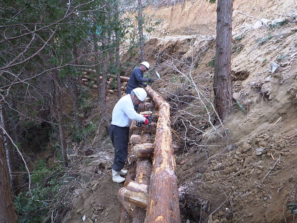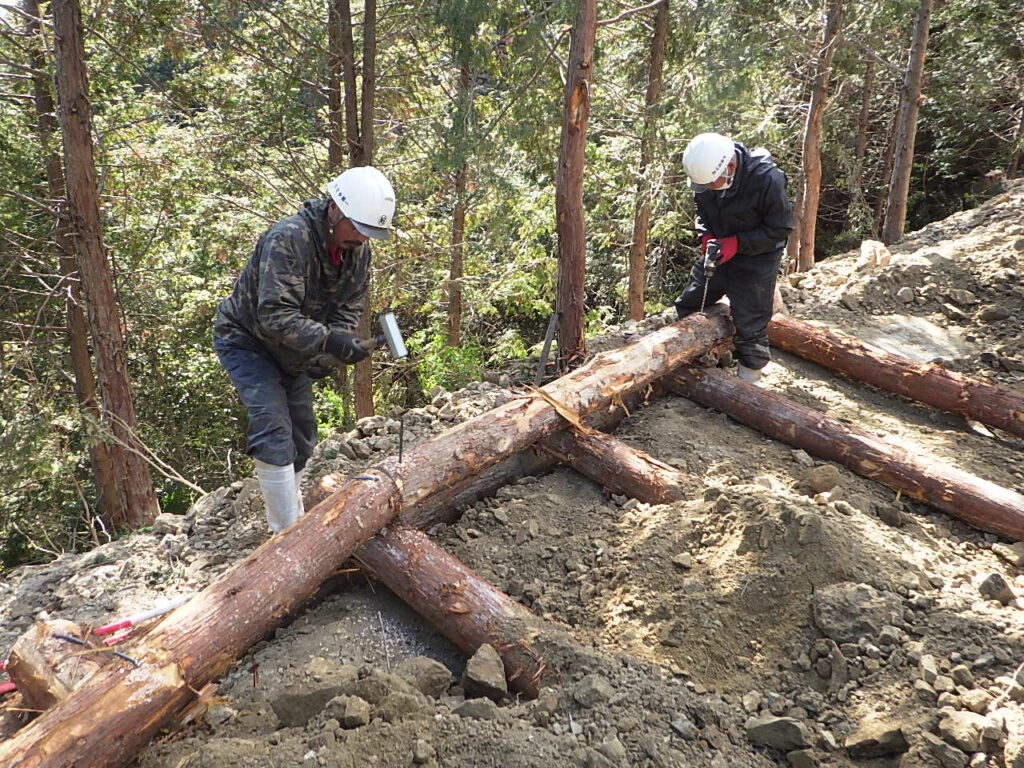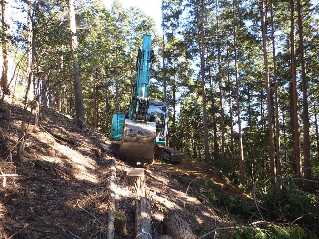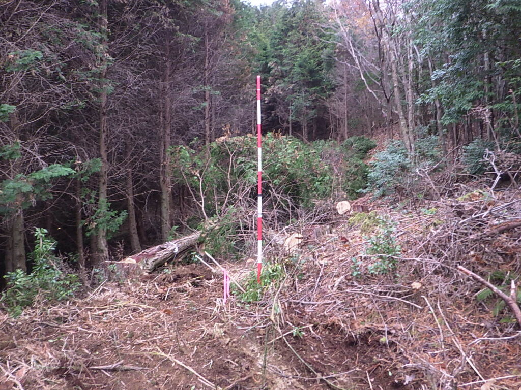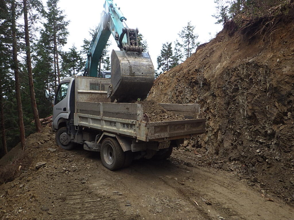 工事概要:施工延長310.0m、施工幅員3.0m、のり留工(2+1)222.0m、敷砂利930.0㎡(L=310.0m×W=3.0m) t=200、チェンソー伐開 1式、作業道修理工事(崩土整理369㎥、路面整備3.5㎥、支障木撤去工1式)